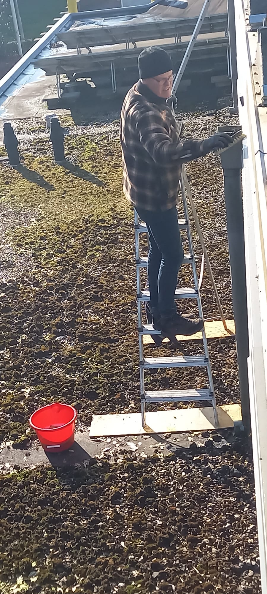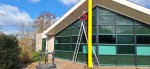Buiten was men bezig met ruiten en kozijnen. Ook de dakranden werden gewassen.