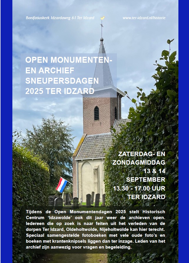 Het Dorpsarchief Idzawolde vestigt nog even de aandacht op de openstelling van zijn archief komend weekend (13 en 14 september) voor de drie dorpen. Voor verdere informatie zie de foto.