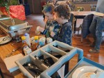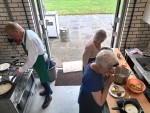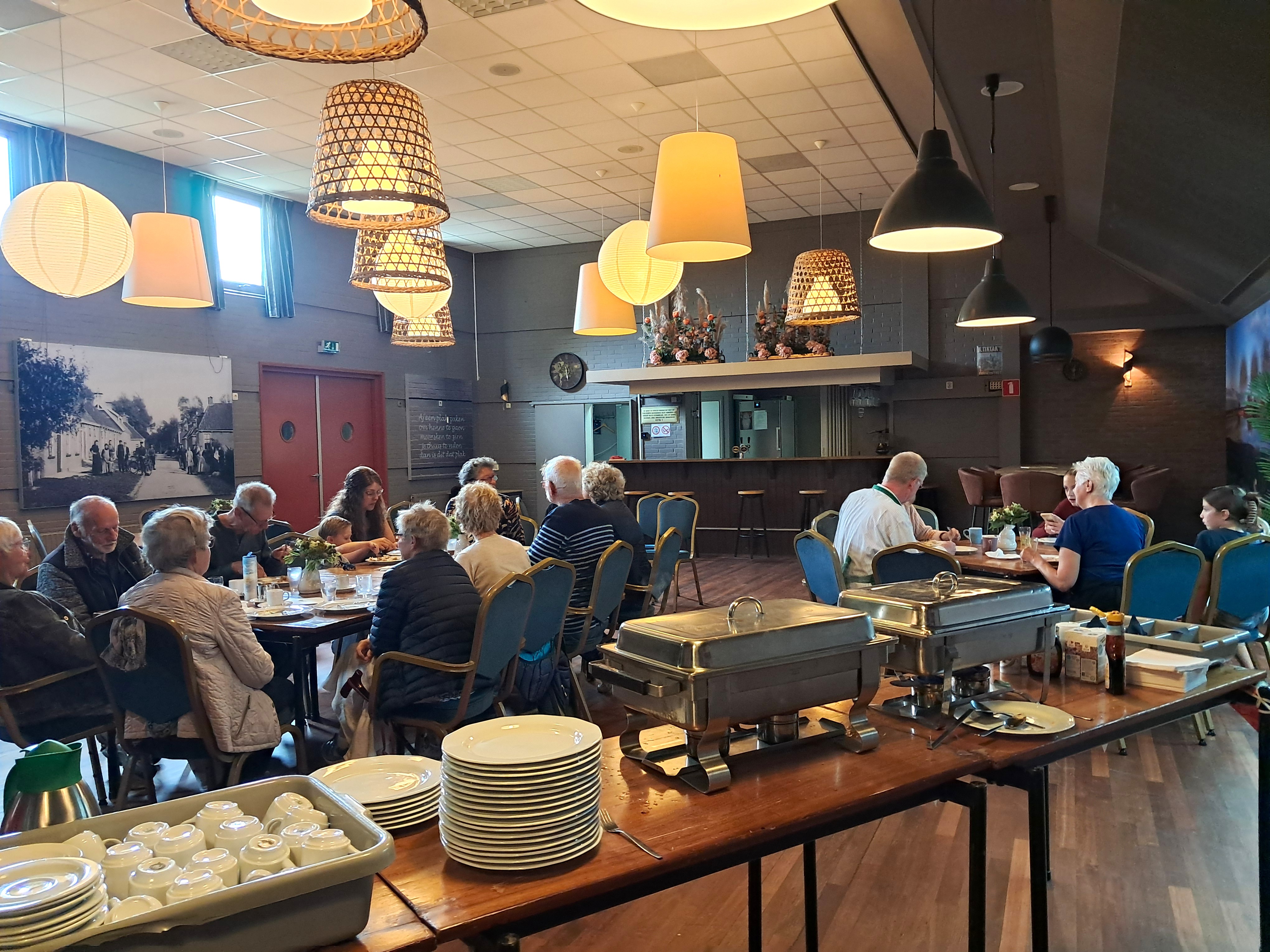 Marijke, Rimmy, Johan en Harry hebben een tijdje in de keuken gestaan om de pannenkoeken te bakken: naturel, met kaas, met spek en met appel. De reacties van de bezoekers waren positief. De pannenkoeken smaakten best. En het was leuk om elkaar weer eens te ontmoeten.
