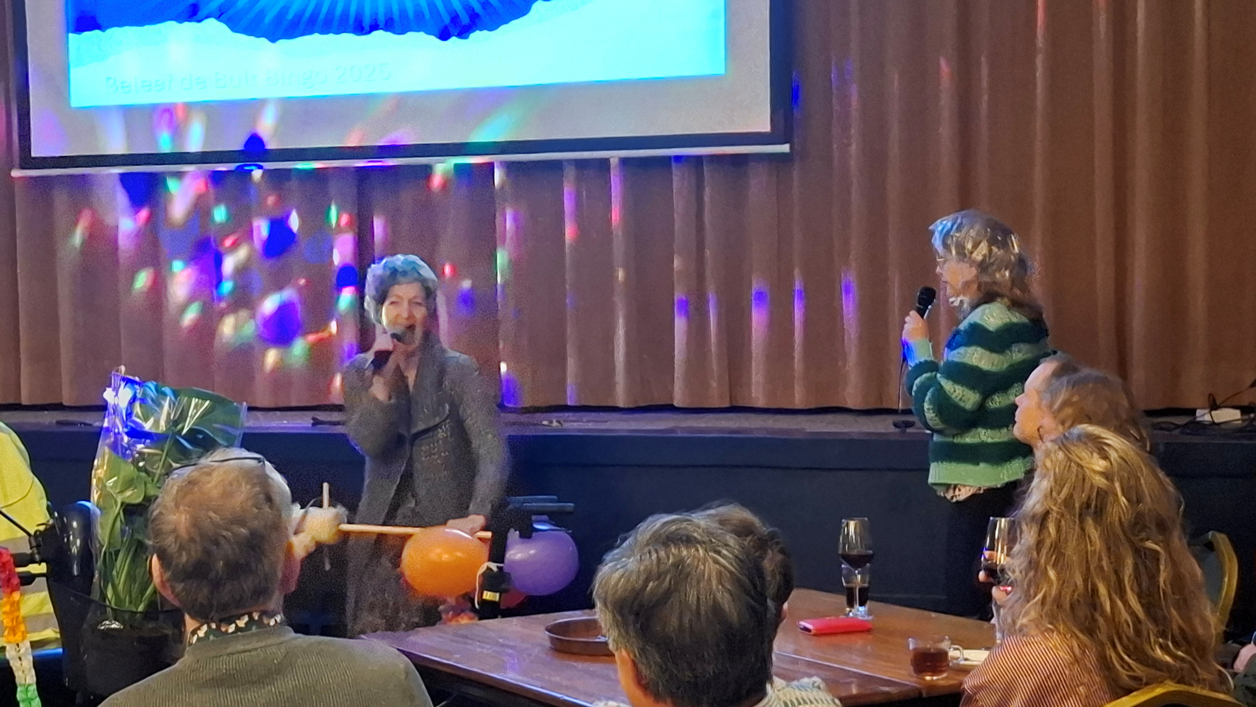 Na een korte pauze was het de beurt aan de seniore dames Betsy en Toos (Inge Meijners en Marleen Strampel) die de zaal opluisterden met een bingo. Ze betraden de zaal met rollator en scootmobiel. De dames brachten gebeurtenissen in onze dorpen in het jaar 2025 voor het voetlicht. Hierbij noemden ze te pas en te onpas getallen op, die de aanwezigen op een uitgereikt bingokaartje konden afstrepen. Volgens Betsy en Toos vond één van die gebeurtenissen plaats op 42 september.