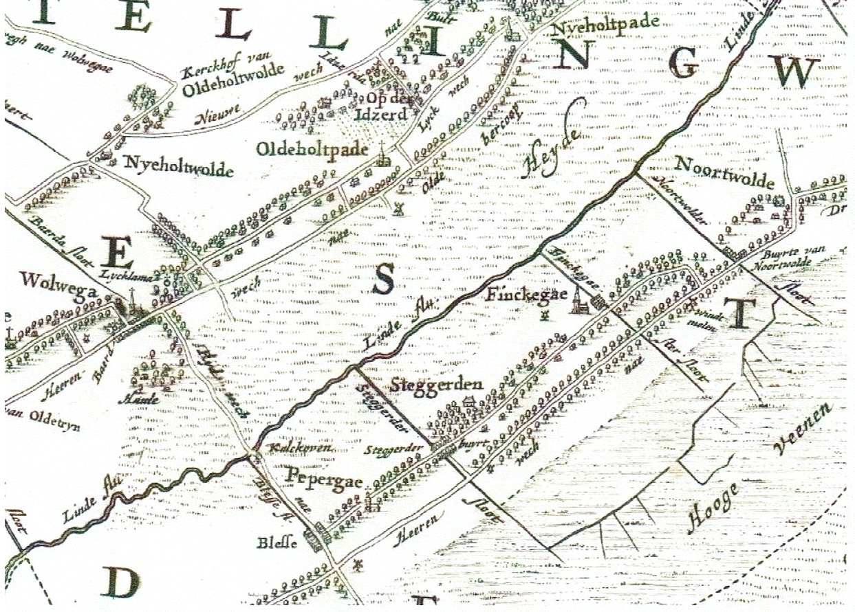 Detail uit de atlas van Schotanus 1664. De stippellijn rechtsonder geeft de grens met Drenthe aan. Duidelijk is te zien hoe diverse watergangen zijn gegraven in de Hooge Veenen achter Steggerda en Vinkega die uitkomen in de Steggerdersloot en uiteindelijk in de Linde.