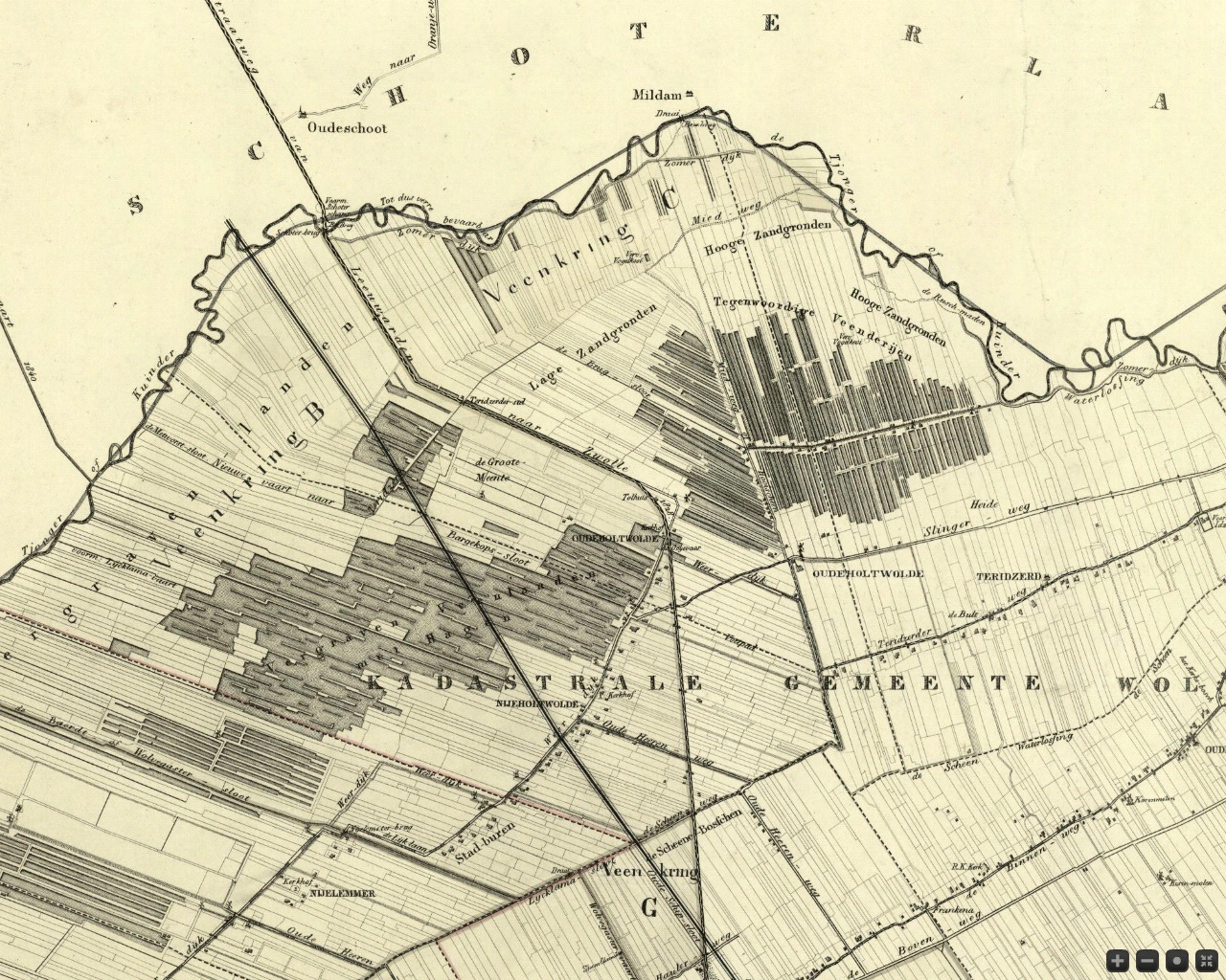 Bovenstaande tekening is een detail uit een verveningskaart van omstreeks 1860. Het donkere aaneengesloten gedeelte geeft het petgatencomplex van Nijeholtwolde en Nijelamer weer dat ontstaan is na de laagveenafgravingen in de periode 1750 – 1850.